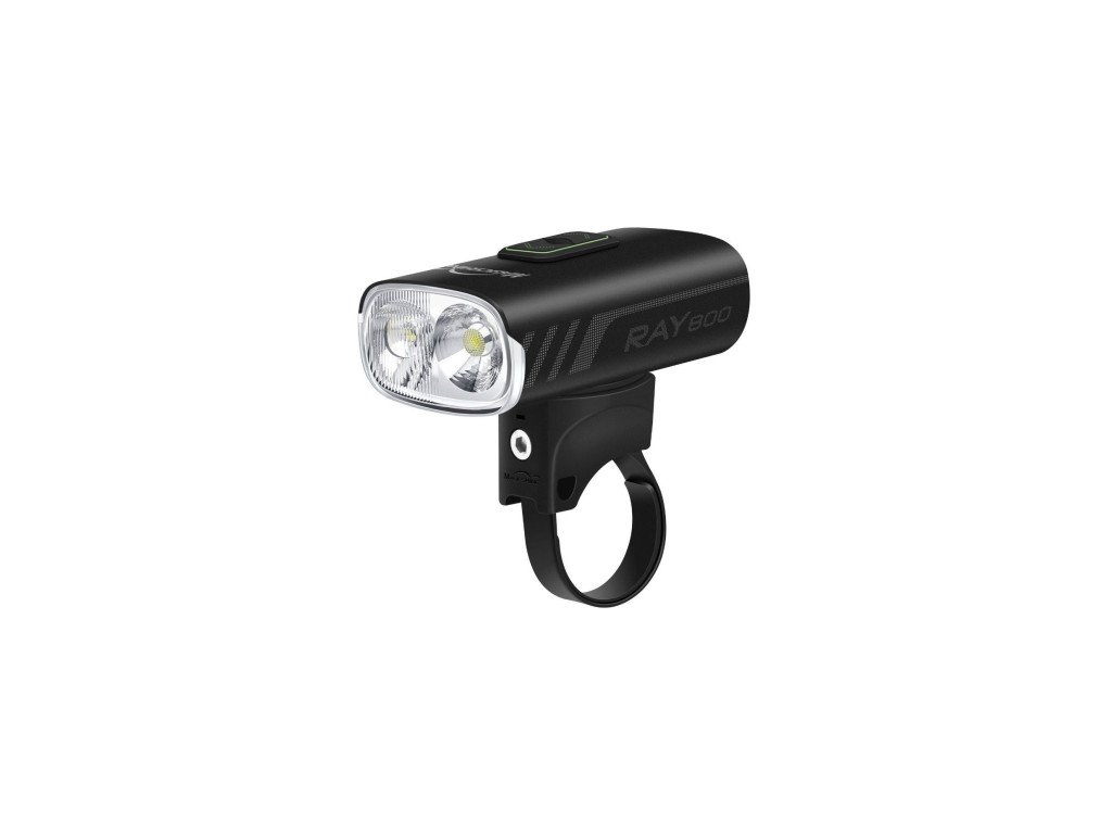 Vďaka dvom vysokovýkonným LED diódam poskytuje RAY 800 pôsobivý výkon až 800 lumenov, čo z neho robí výnimočné všestranné zariadenie, ktoré plynule prechádza z mestských ulíc na náročné chodníky. RAY 800 je základný model radu RAY. Ponúka výkon až 800 lumen s kapacitou batérií 1700mAh. Rad RAY sa vyznačuje špeciálnou optikou, s oddeleným diaľkovým a stretávacím reflkektorom a ďalej dvojitým ovládacím tlačidlom, ktoré umožňuje ovládať intenzitu svietenia hore a dole(nie je súčasťou balenia). RAY 800 je vhodný ako univerzálne svietidlo pre všetky typy cyklistiky - cestné, gravel, MTB, s montážou na prilbu pre downhill. Farebný LED indikátor stavu batérie. Duálne ovládacie tlačidlo intenzít jasu "hore a dole".